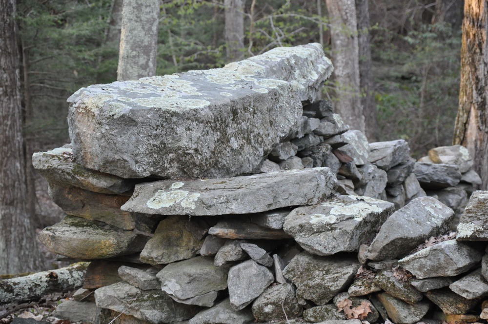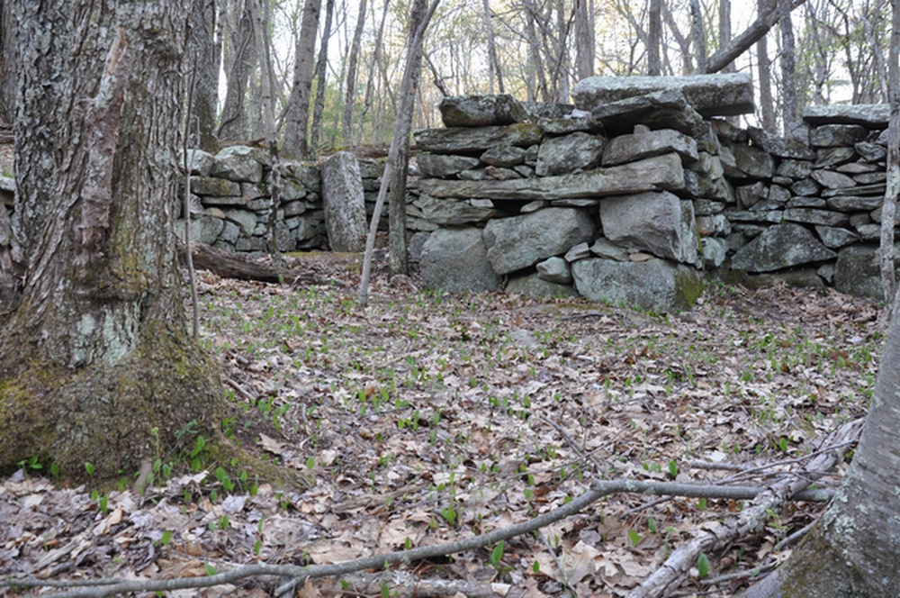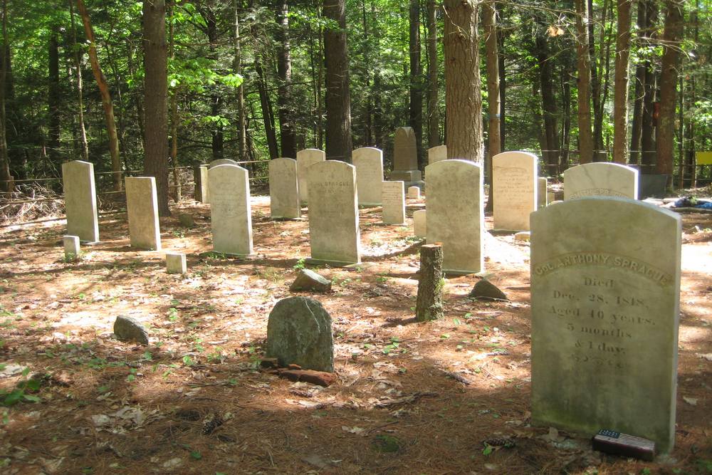 Sprague Farm is a fine place to walk, and the trip tempts us to speculate about the use of the property 100 or more years ago. For example, the many well-constructed stone walls crisscrossing the land indicate its separation into pastures and the presence of cattle and/or sheep. In a few places, old barbed wire and wire fencing used to separate pasture or property lines is still visible, though deeply embedded in tree trunks. The trail map shows the old roads, now used as wide walking trails, and these pass over well-constructed stone bridges. There are also three groups of stone foundations. Of these some supported houses as they are quite large and contain chimney bases. Others may have been barns and, perhaps, housing for workers. The Sprague family cemetery, located near Joe Sweet Rd., contains the gravesite of Col. Anthony Sprague and his descendents.