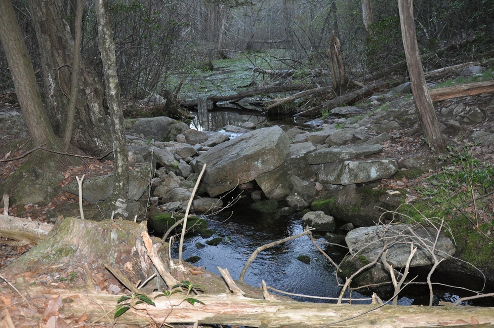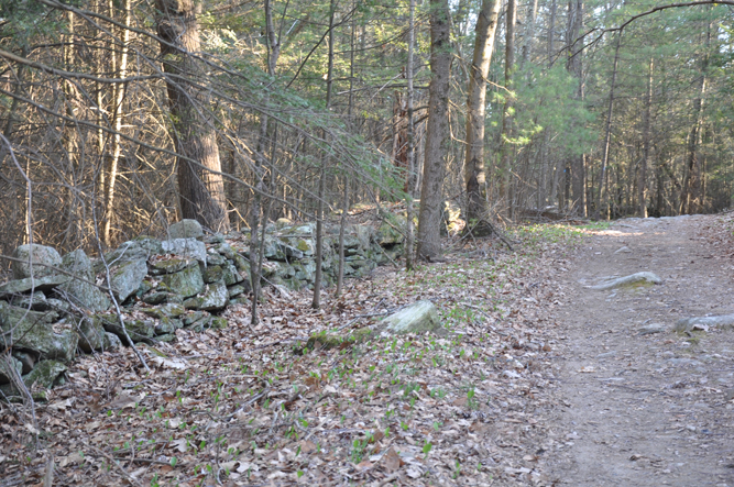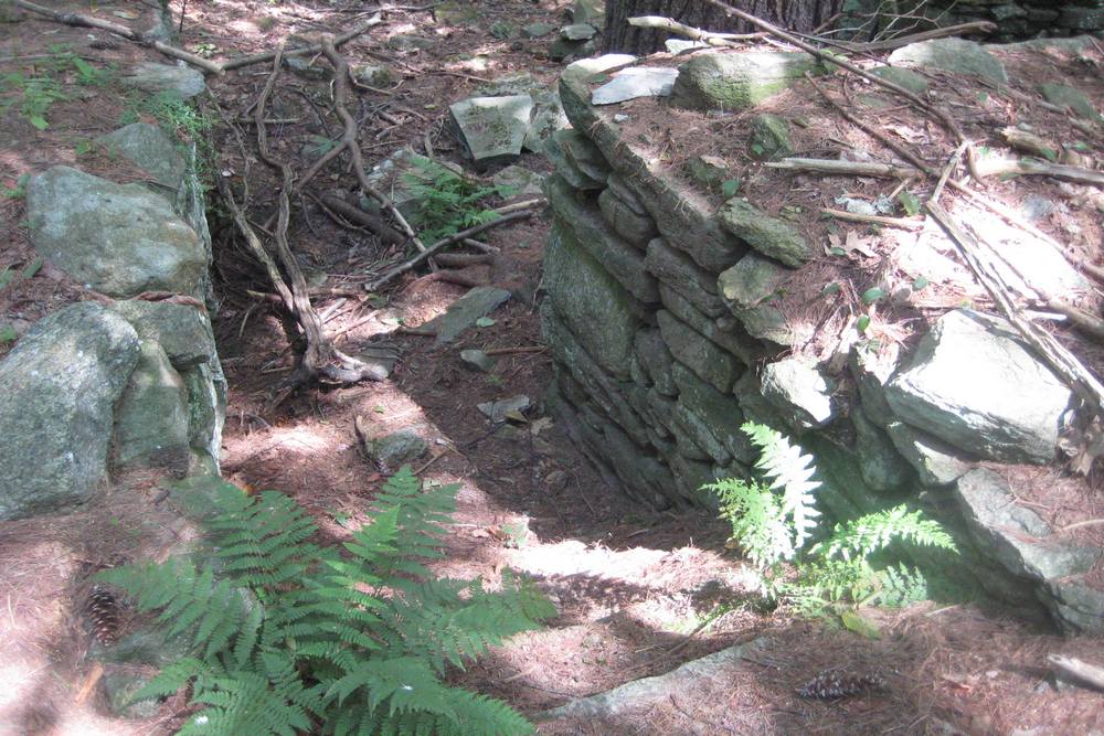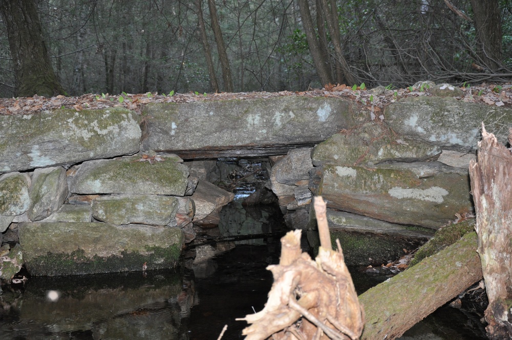 Sprague Farm is a fine place to walk, and the trip tempts us to speculate about the use of the property 100 or more years ago. For example, the many well-constructed stone walls crisscrossing the land indicate its separation into pastures and the presence of cattle and/or sheep. In a few places, old barbed wire and wire fencing used to separate pasture or property lines is still visible, though deeply embedded in tree trunks. The trail map shows the old roads, now used as wide walking trails, and these pass over well-constructed stone bridges. There are also three groups of stone foundations. Of these some supported houses as they are quite large and contain chimney bases. Others may have been barns and, perhaps, housing for workers. The Sprague family cemetery, located near Joe Sweet Rd., contains the gravesite of Col. Anthony Sprague and his descendents.